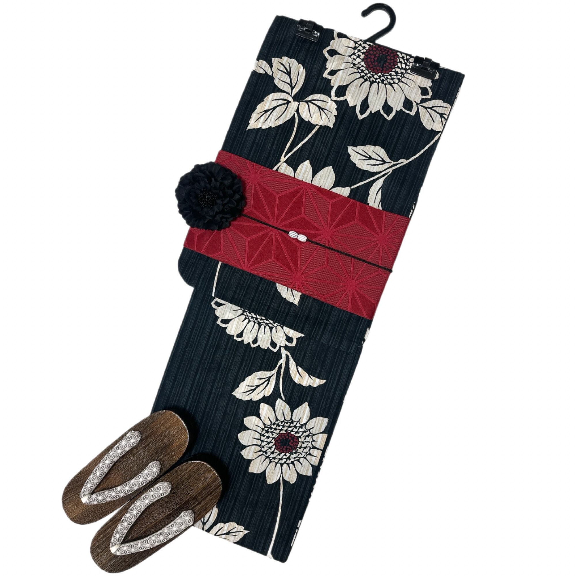 浴衣ジェンヌ 浴衣5点セット 向日葵 綿 ゆかた 半幅帯 浴衣 黒地 ひまわり 赤