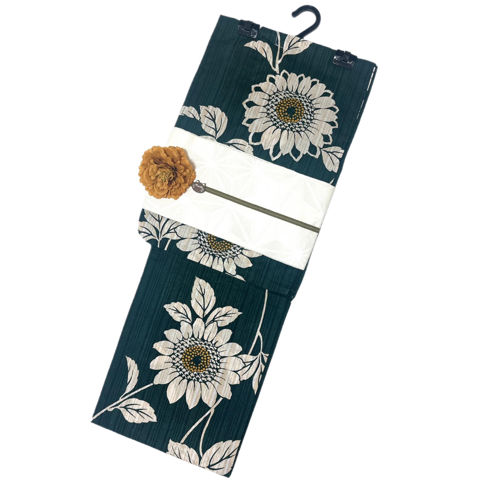 浴衣ジェンヌ 浴衣5点セット 向日葵 綿 ゆかた 半幅帯 浴衣 濃緑 グリーン ひまわり