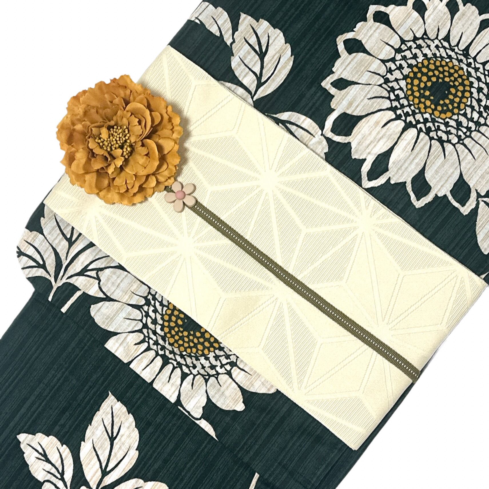 浴衣ジェンヌ 浴衣5点セット 向日葵 綿 ゆかた 半幅帯 浴衣 濃緑 グリーン ひまわり