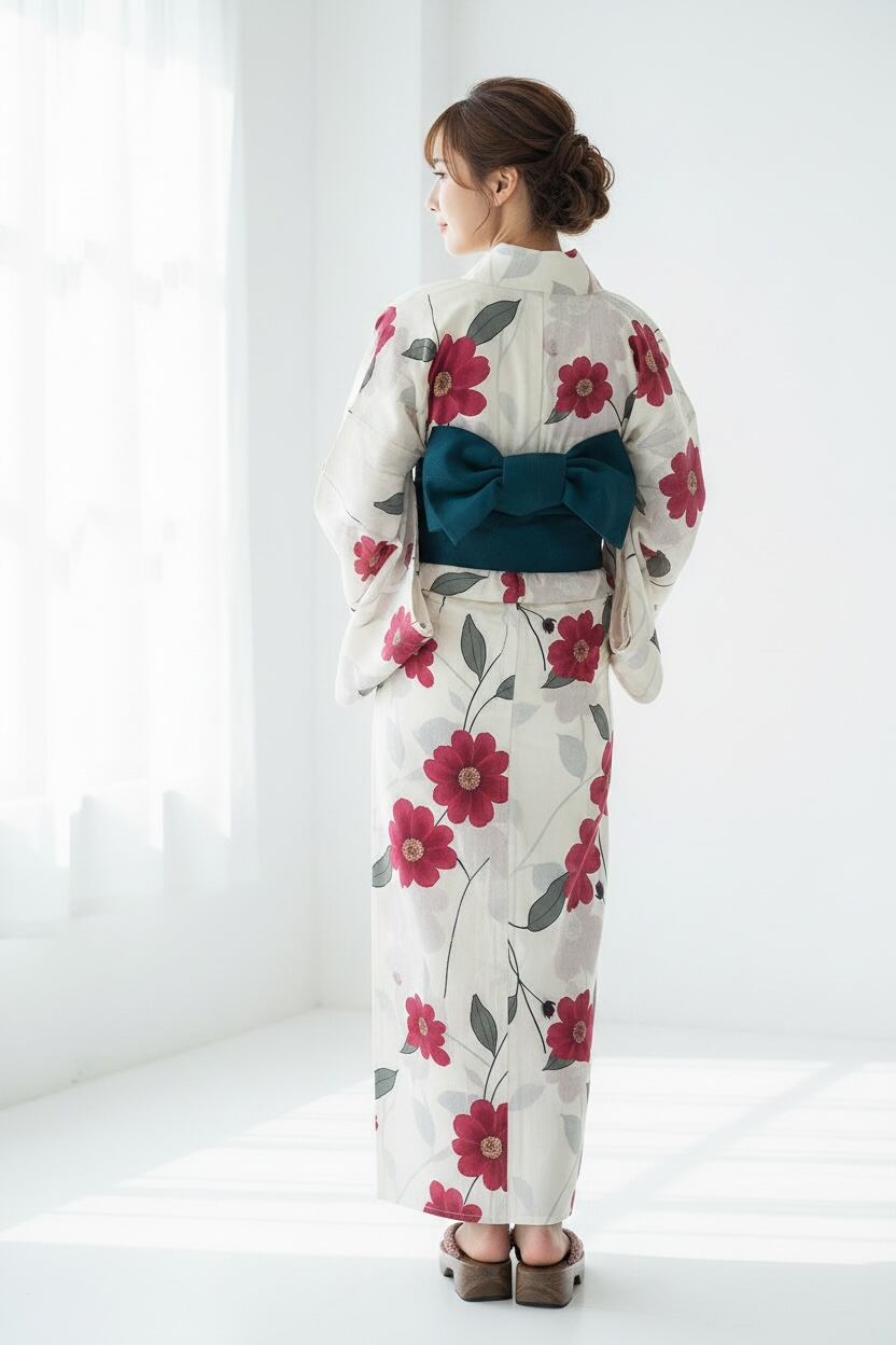 浴衣ジェンヌ 浴衣5点セット オフホワイトに赤の花 綿 ゆかた 半幅帯 浴衣
