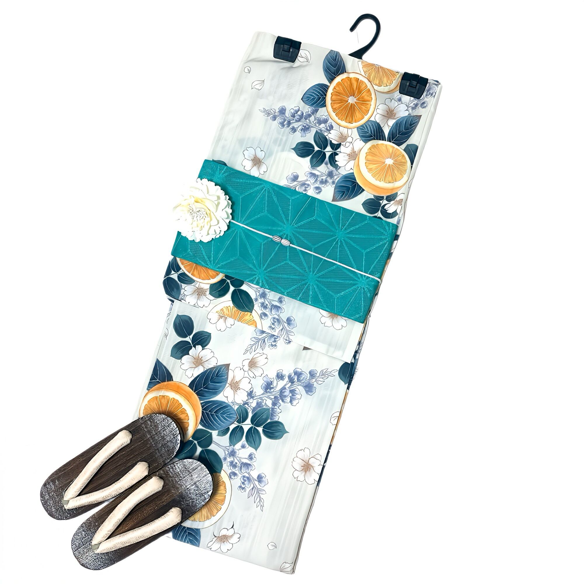 浴衣ジェンヌ 新作 浴衣5点セット オフホワイト オレンジ フルーツ柄 浴衣