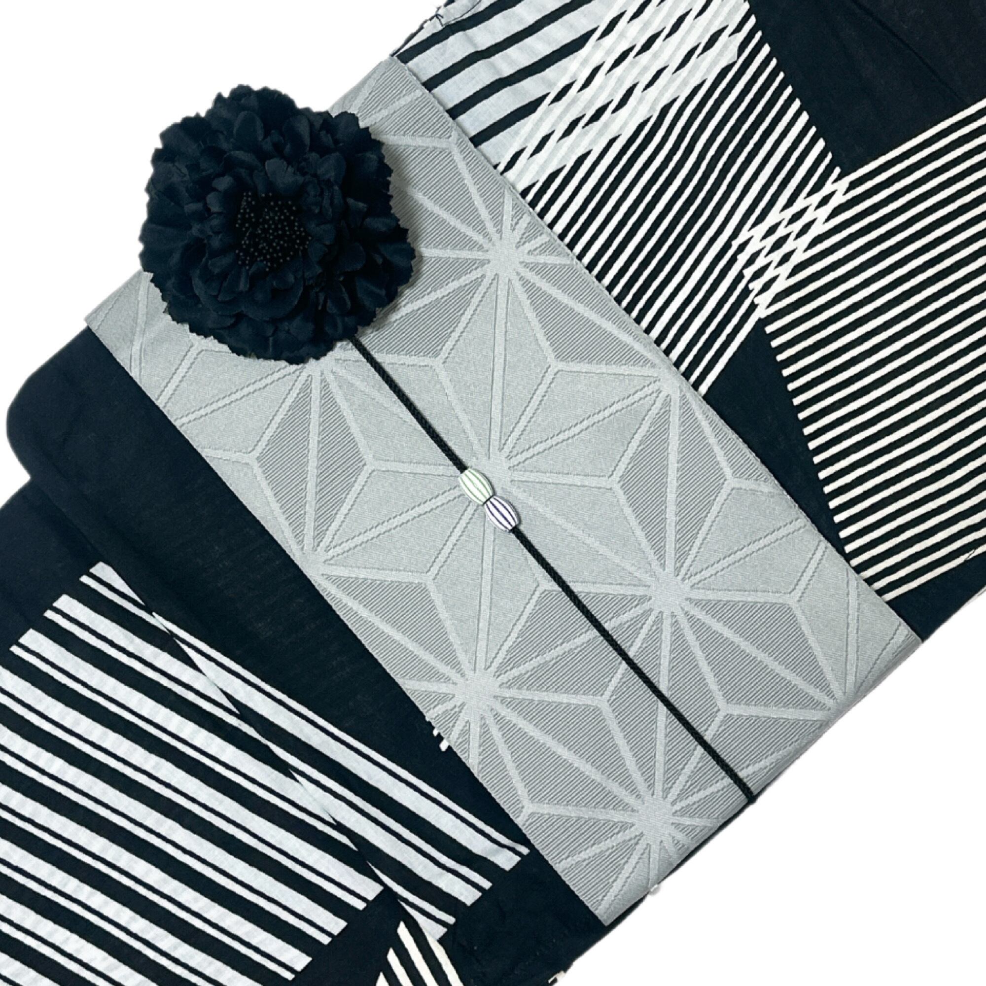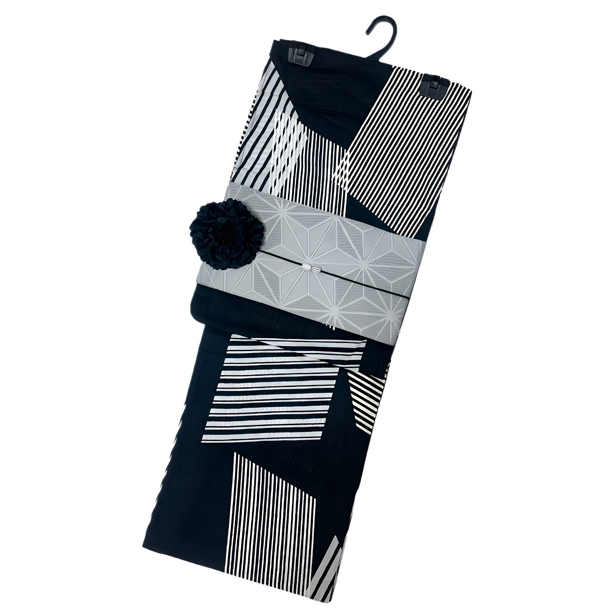浴衣ジェンヌ 浴衣5点セット 黒 白 幾何学 浴衣 モノトーン 半幅帯 下駄