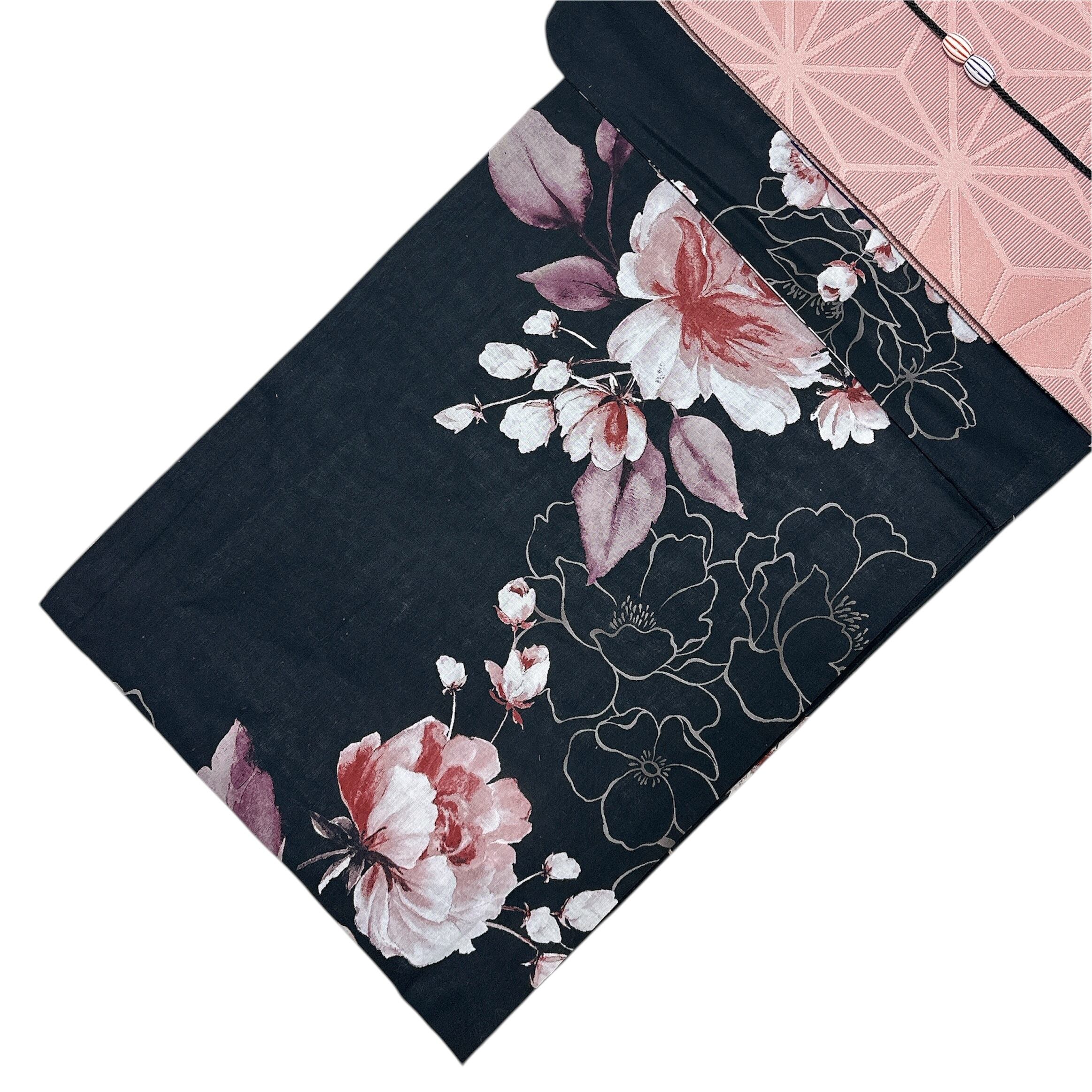 浴衣ジェンヌ 浴衣5点セット 綿 ゆかた 半幅帯 浴衣 黒地 ピンク 花柄