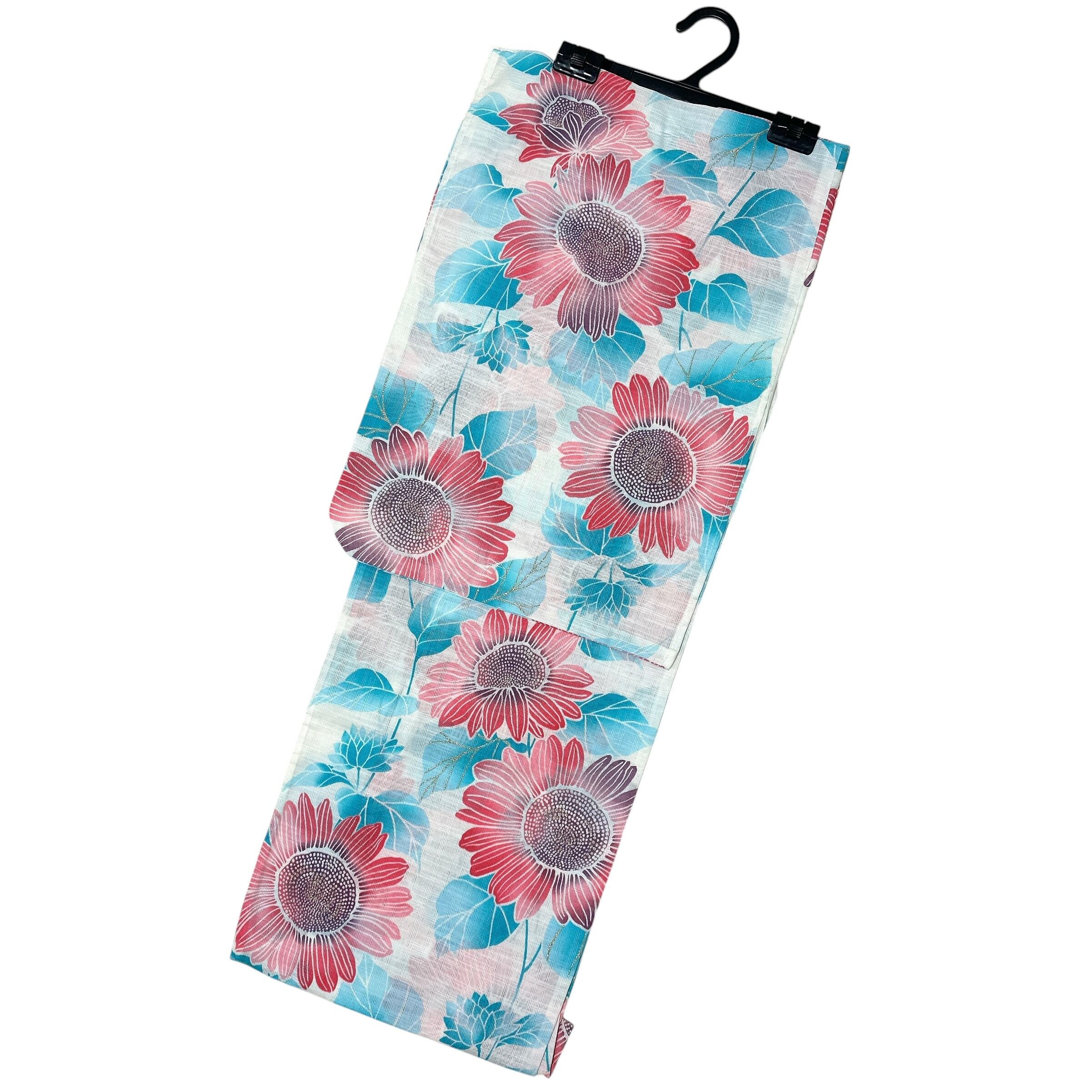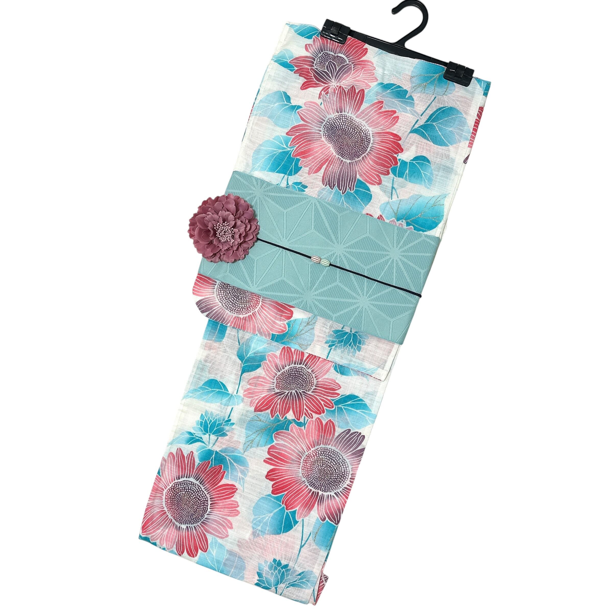 浴衣ジェンヌ 浴衣5点セット 綿 白地にピンクのひまわり 向日葵 ゆかた 半幅帯 浴衣