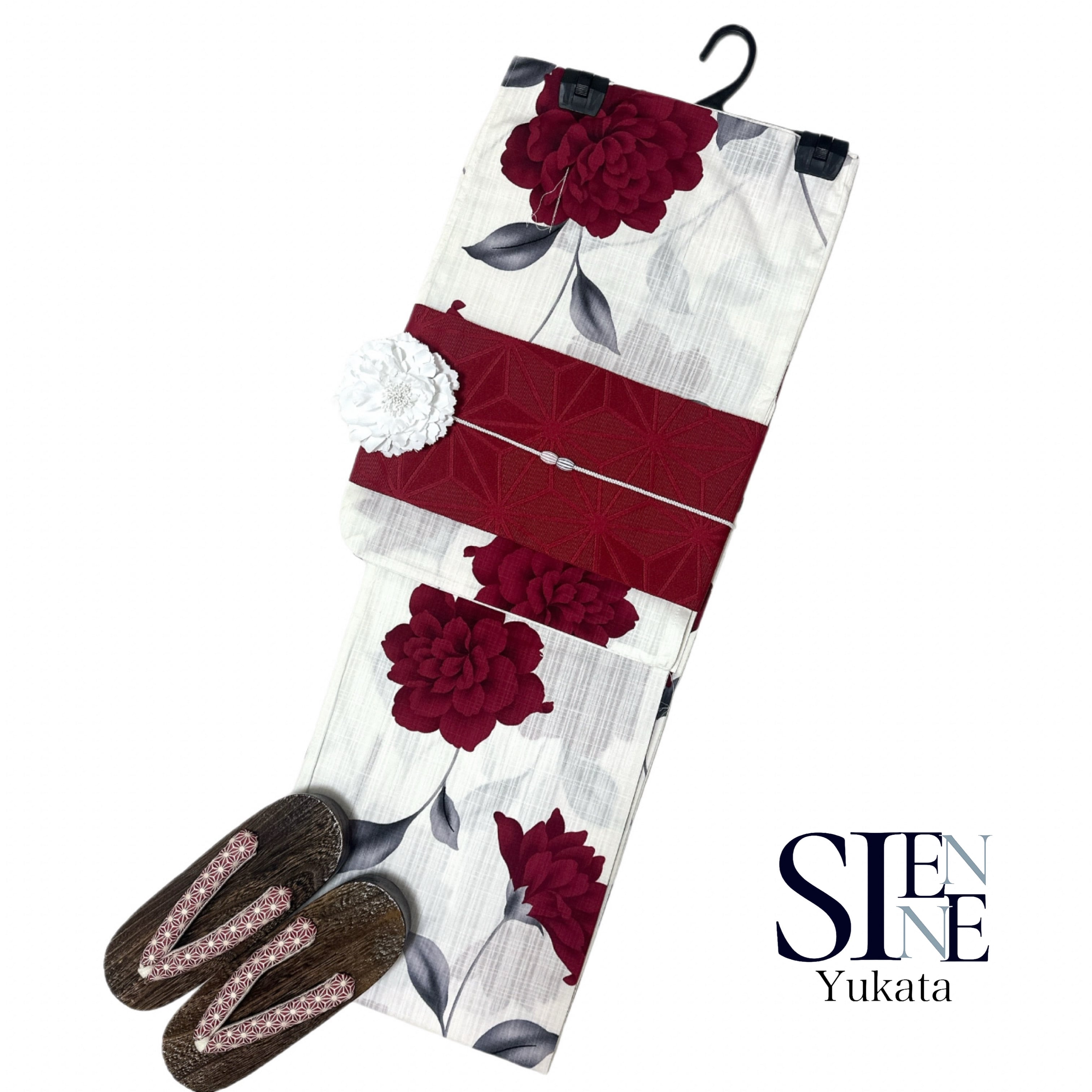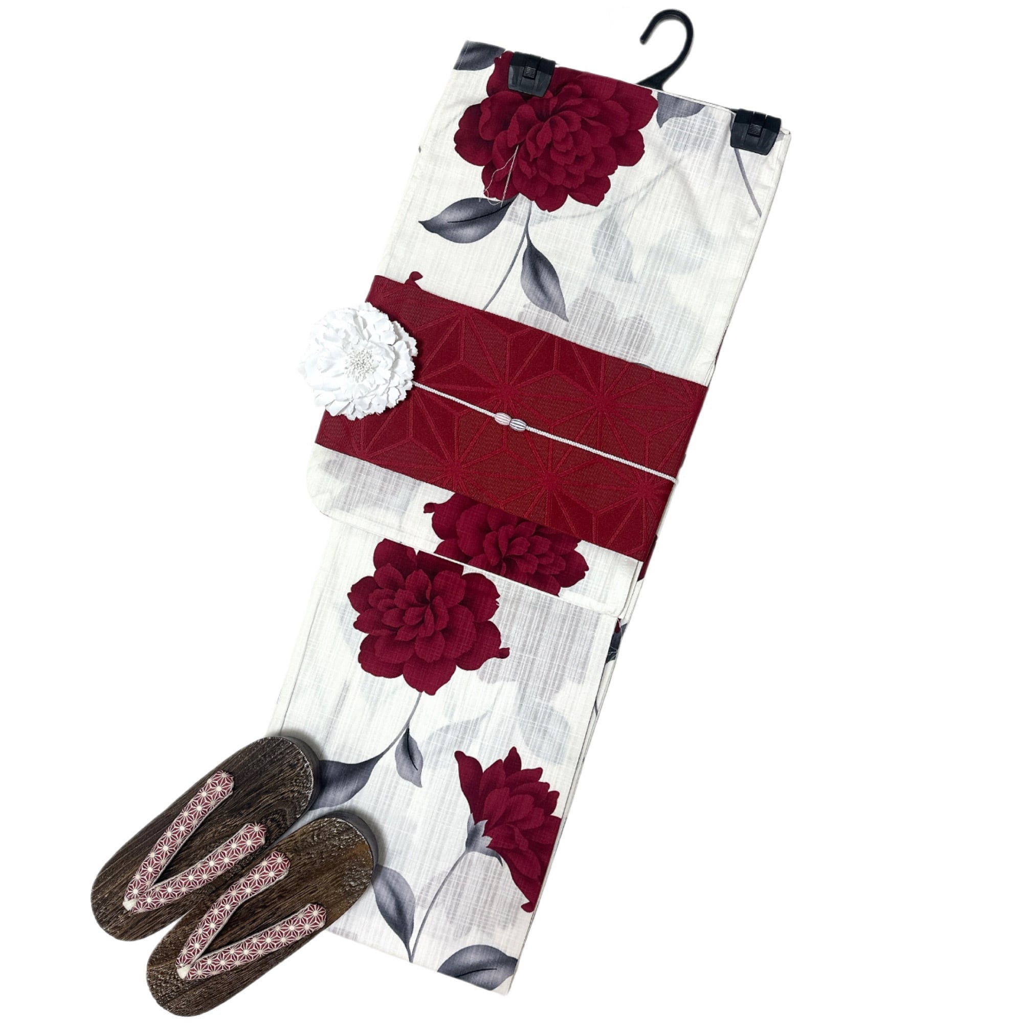 浴衣ジェンヌ 浴衣5点セット 白地に赤のダリア 浴衣 大人 レディース浴衣
