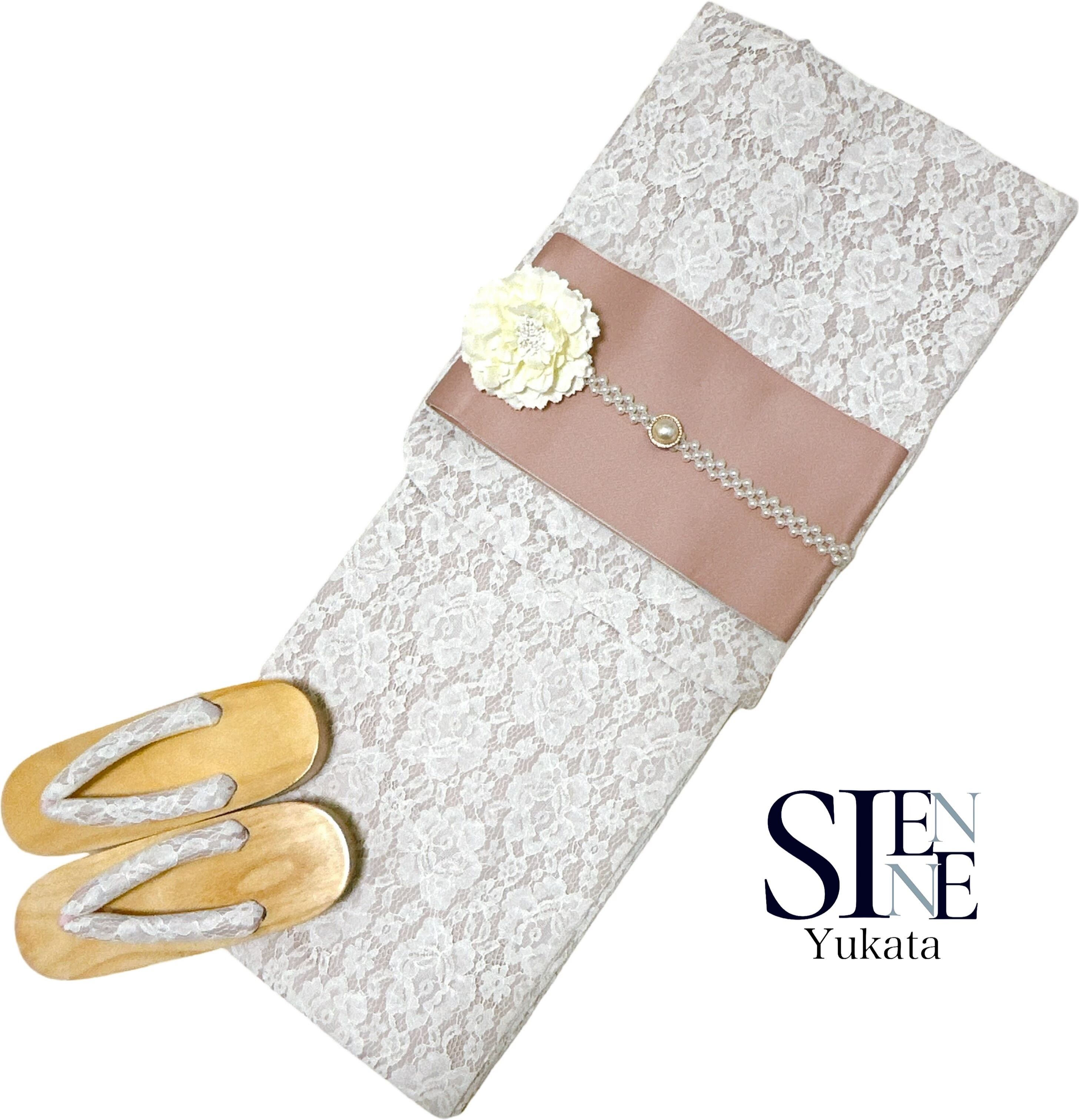 浴衣ジェンヌ 新作 高級 総レース浴衣5点セット くすみピンク×白レース