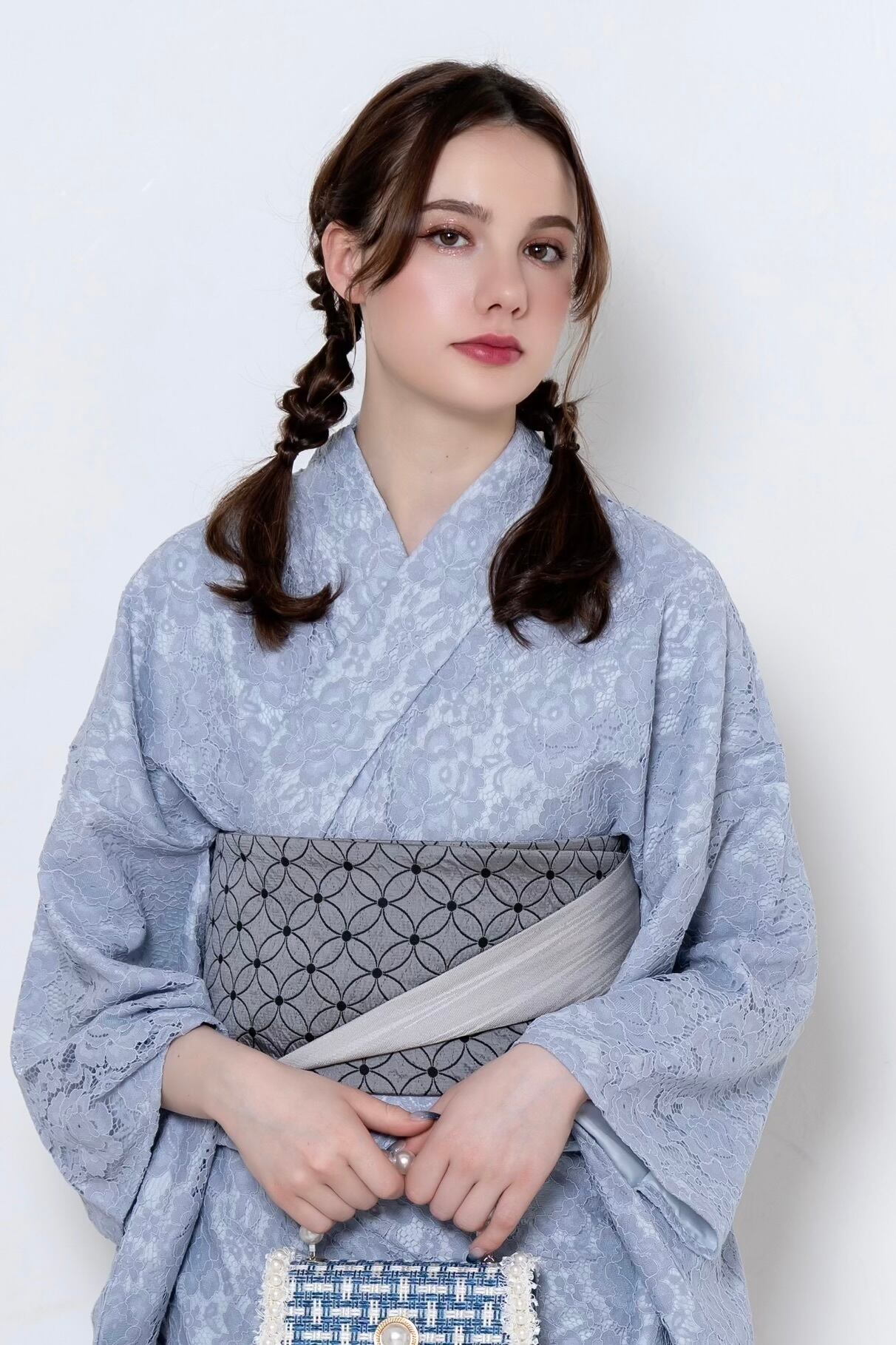浴衣ジェンヌ 浴衣3点セット 高級 総レース浴衣 ブルー 袋帯 着物風浴衣 着物風コーデ