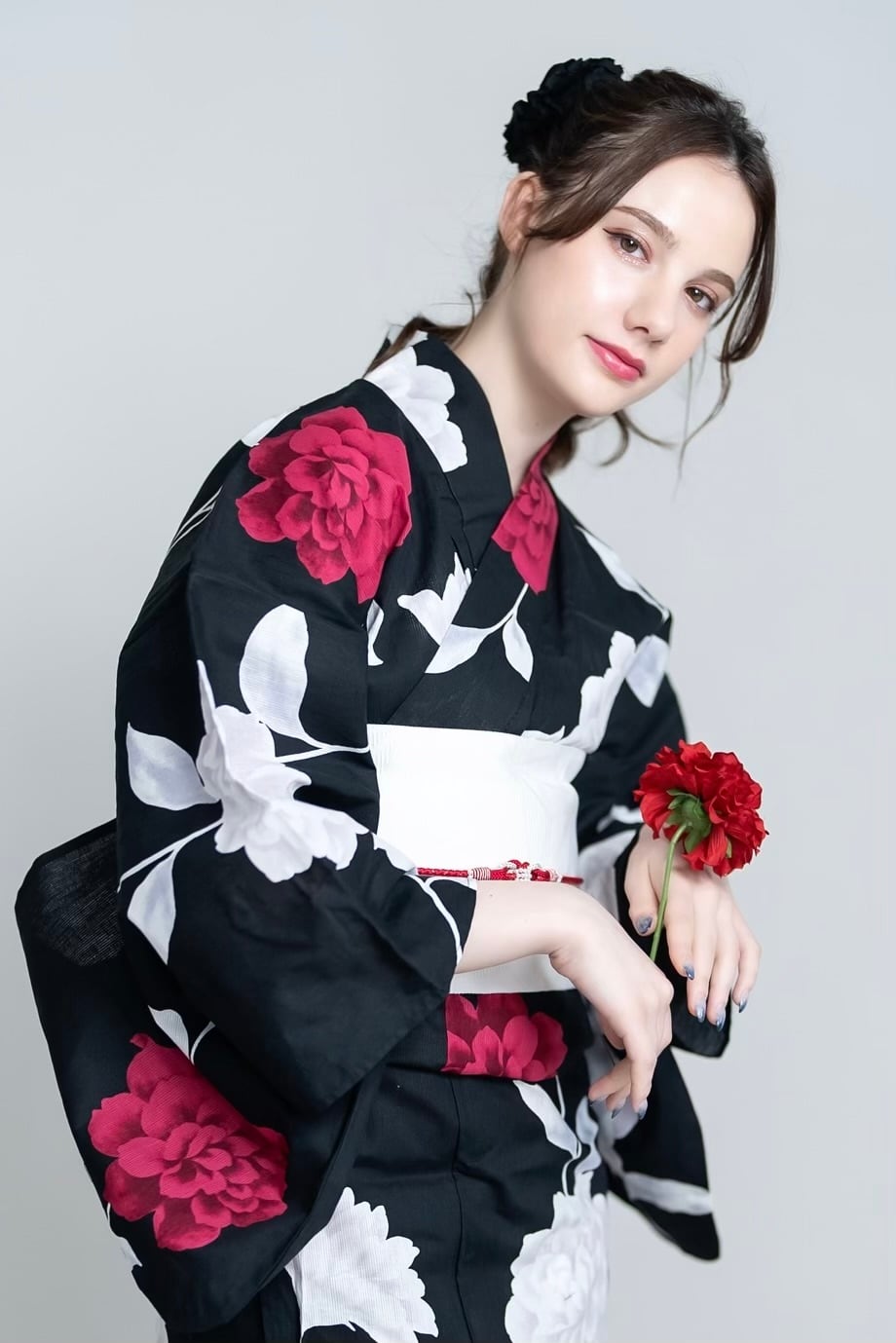 浴衣ジェンヌ 浴衣3点セット 黒地にローズレッドと白のダリア