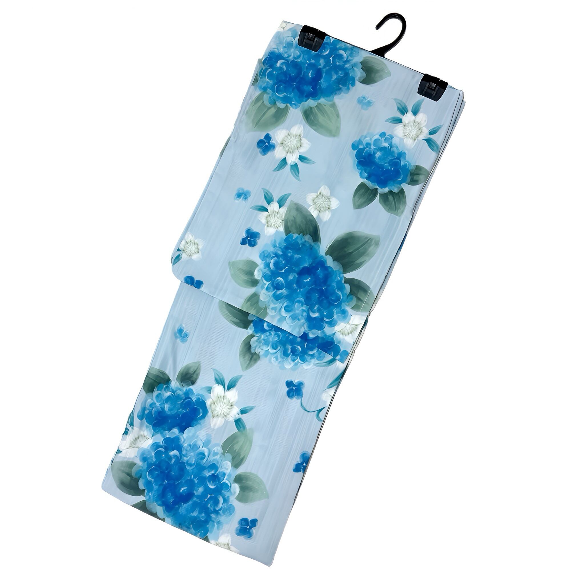 浴衣ジェンヌ 浴衣5点セット 水彩画調の紫陽花や菖蒲 ライトブルー 半幅帯