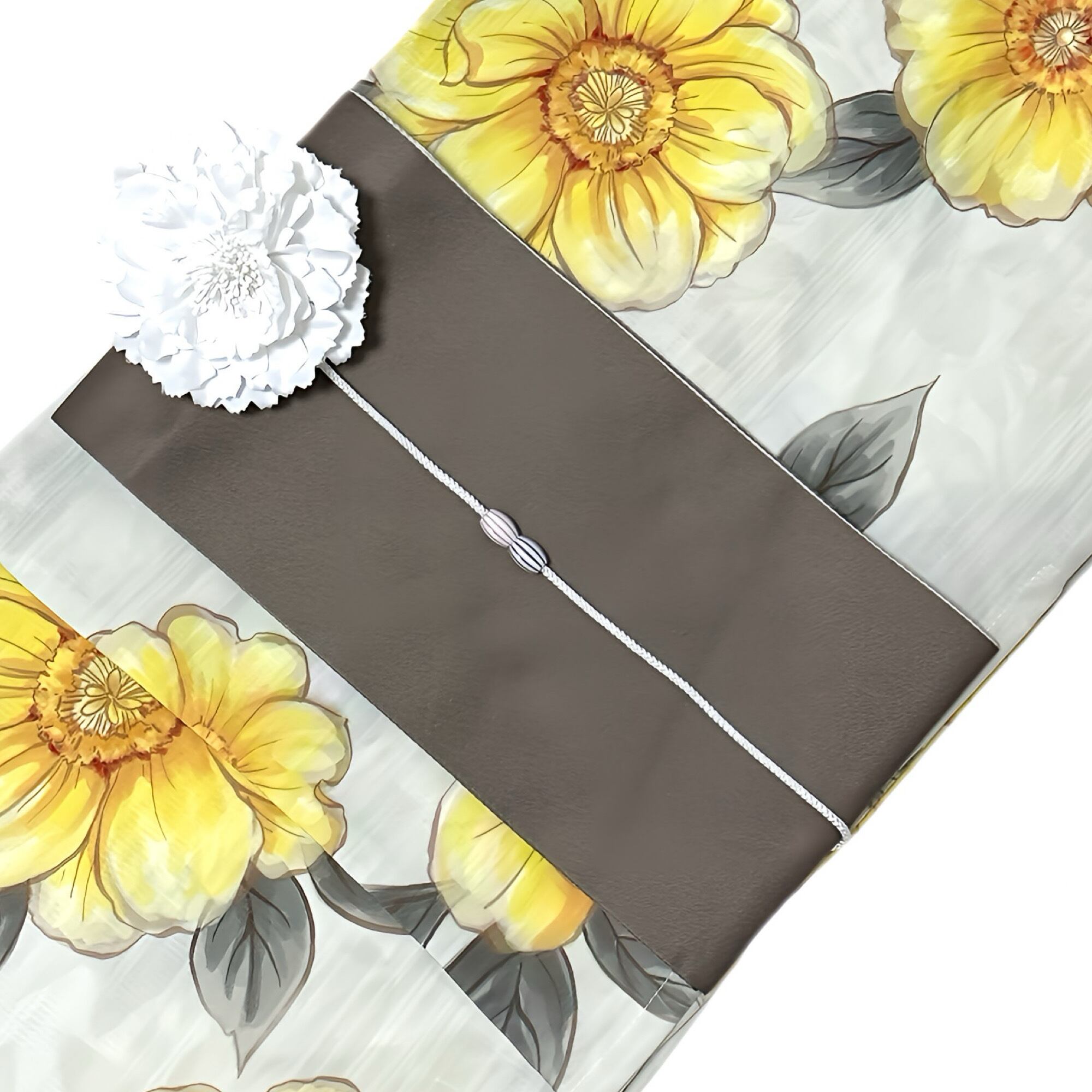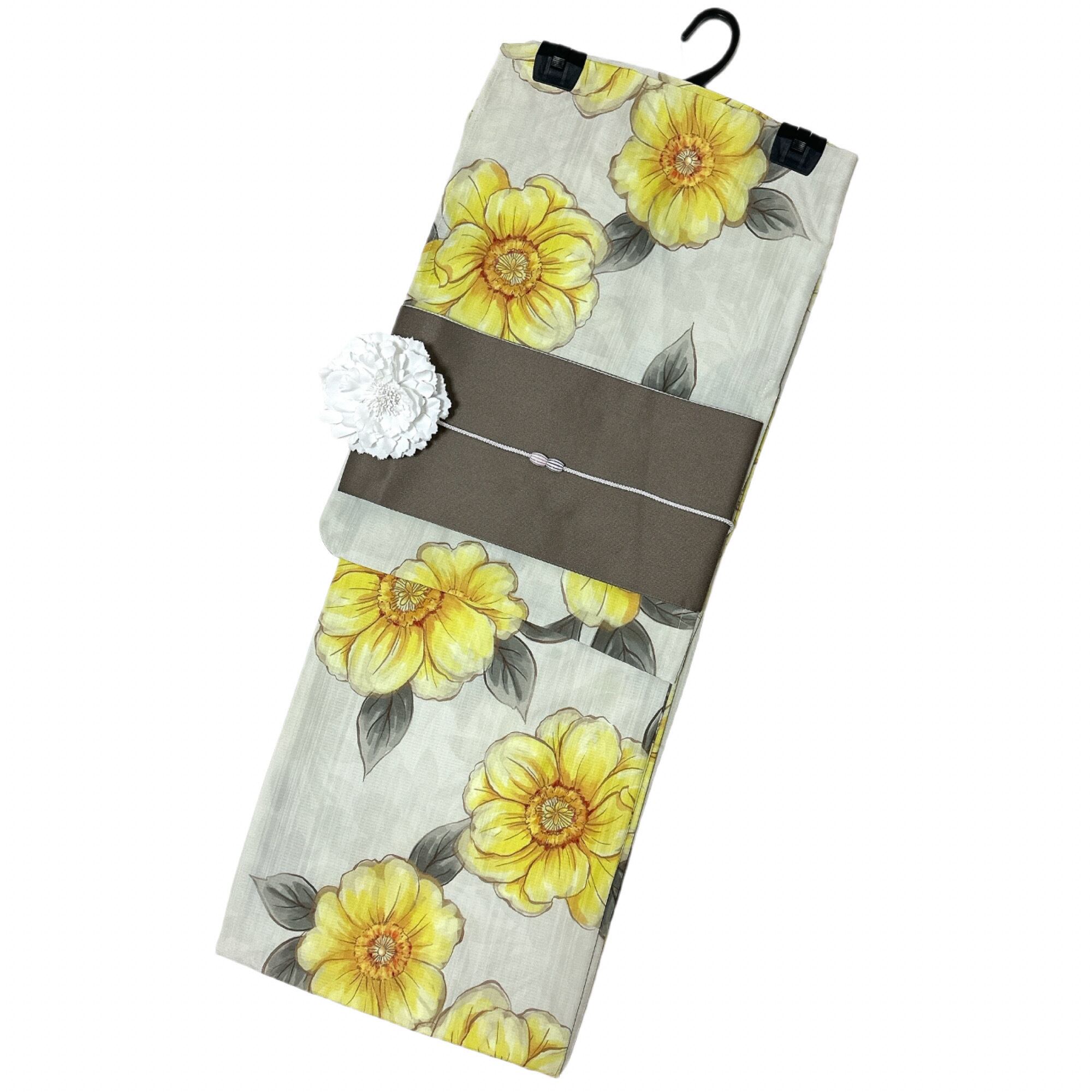 浴衣ジェンヌ 浴衣5点セット 生成り×黄色 半幅帯 カフェオレブラウン