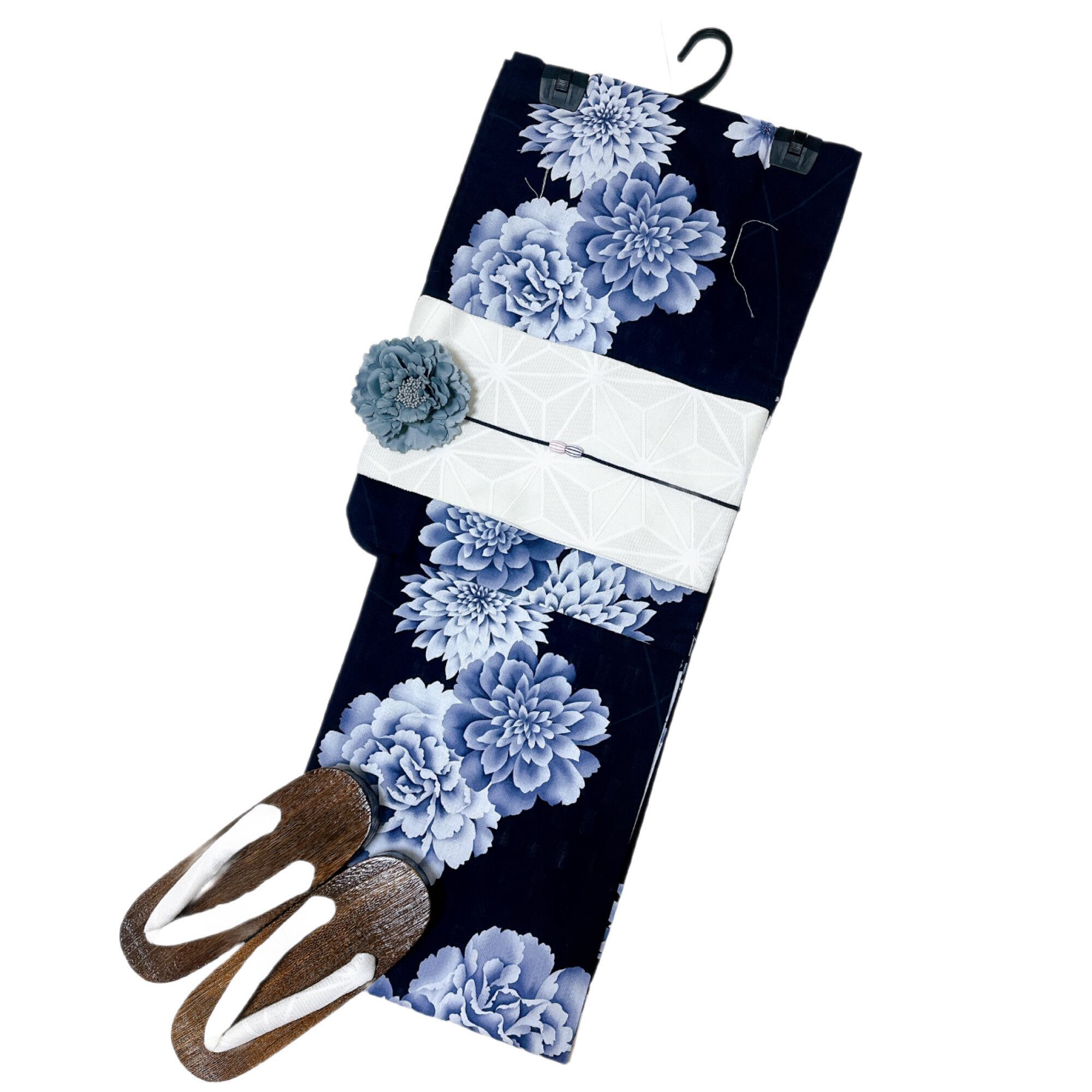 浴衣ジェンヌ 浴衣5点セット 紺地にダリア 濃紺 ゆかた 半幅帯 浴衣