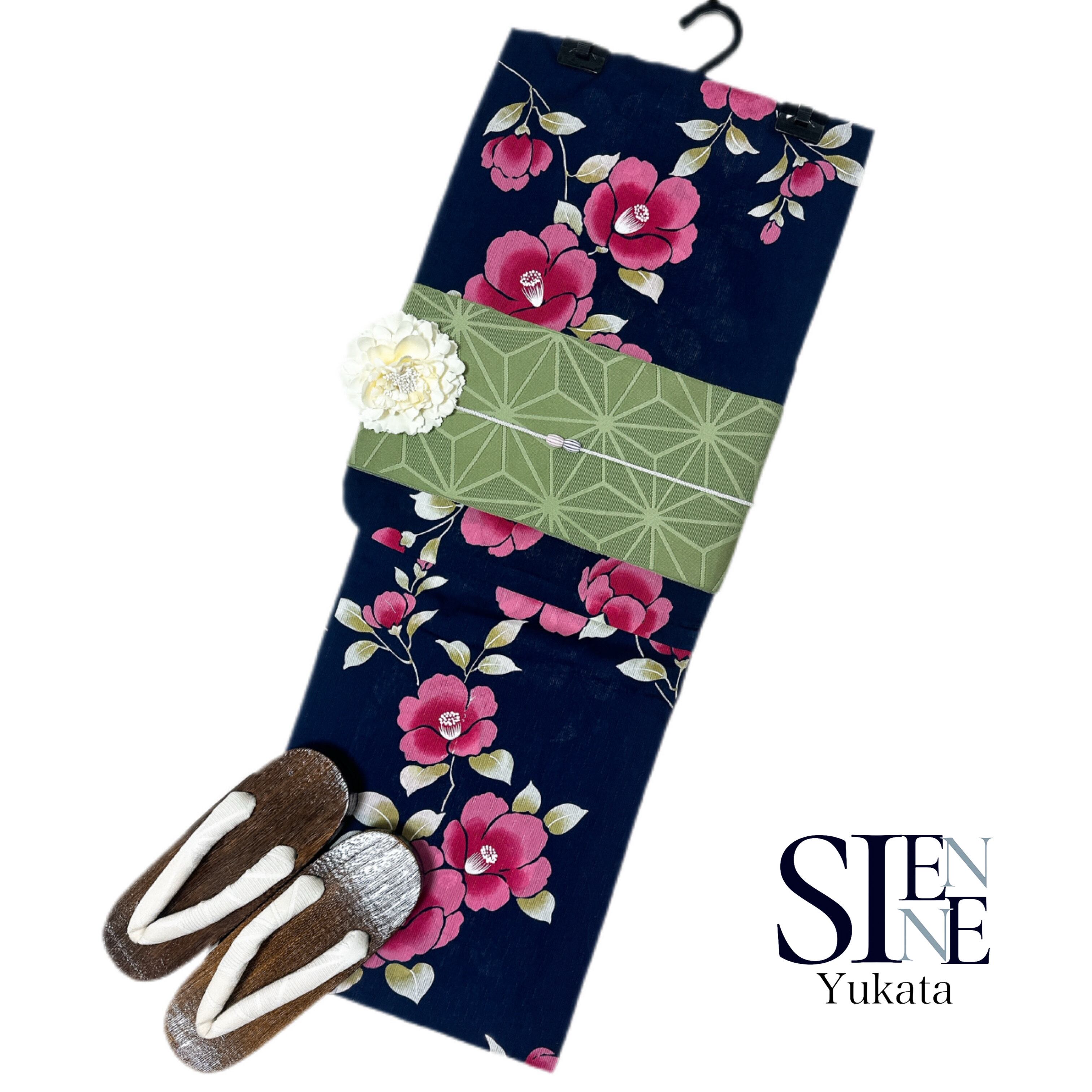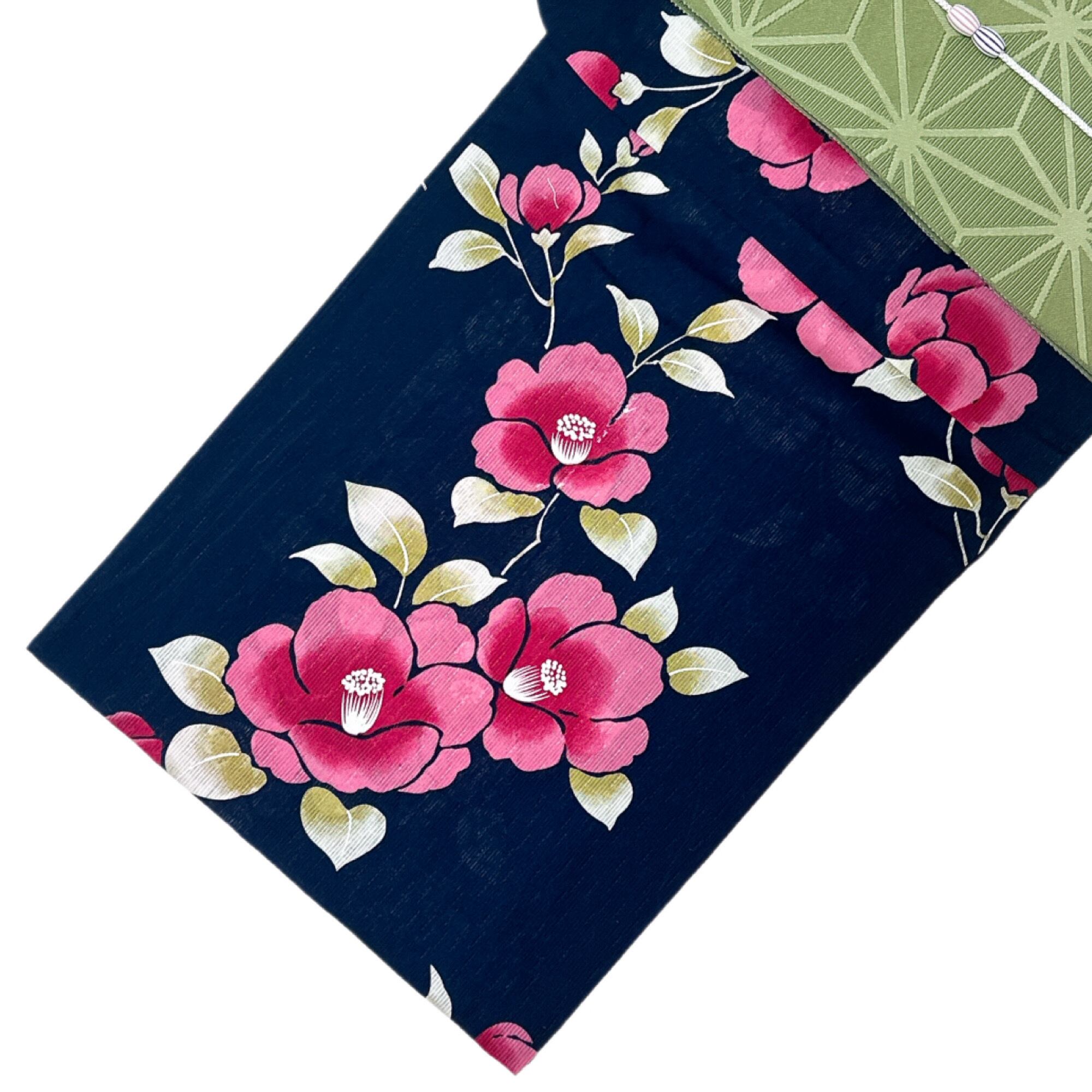 浴衣ジェンヌ 浴衣5点セット 綿麻素材 濃紺 紺地 椿 ゆかた 半幅帯 浴衣