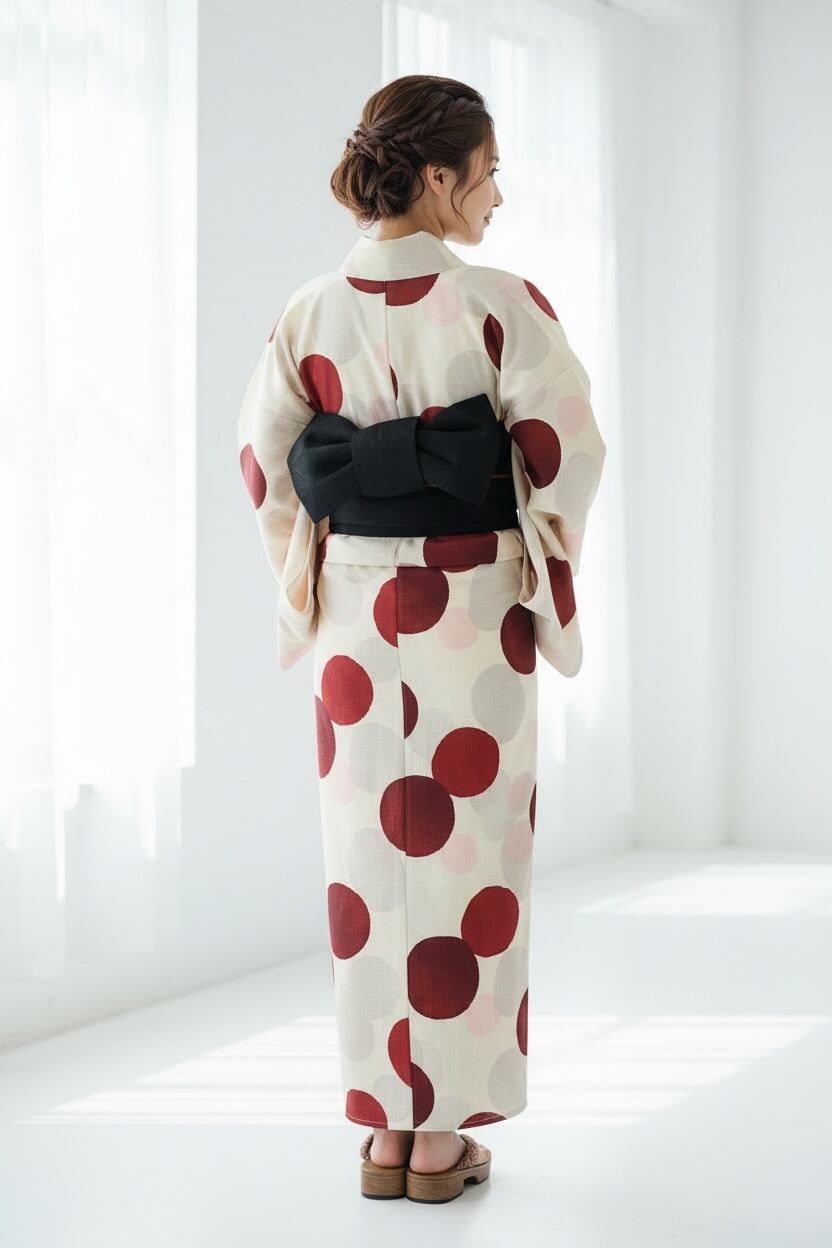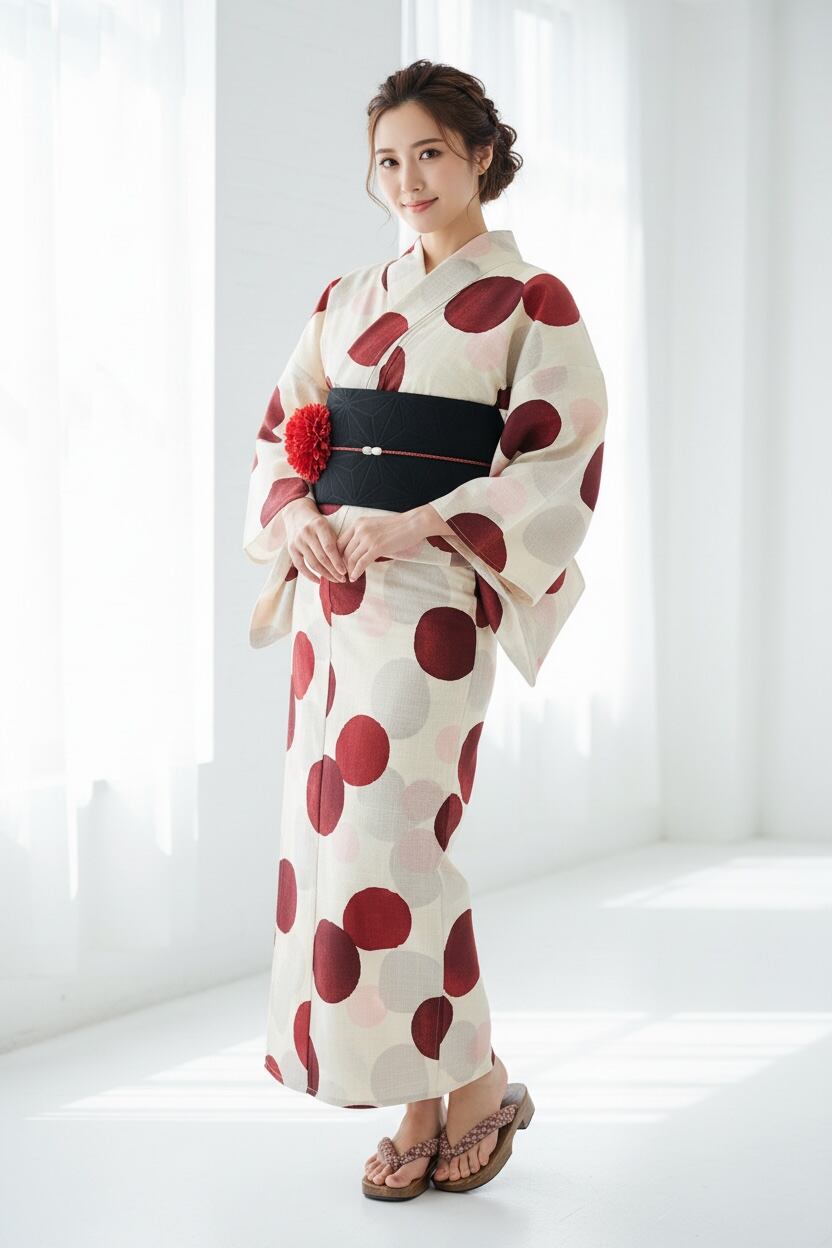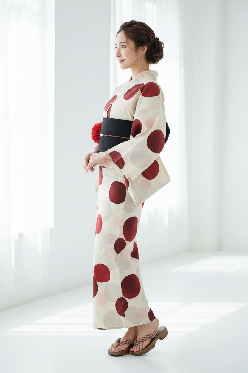 浴衣ジェンヌ 浴衣5点セット 生成りに赤と淡いピンクのぼかしドット柄