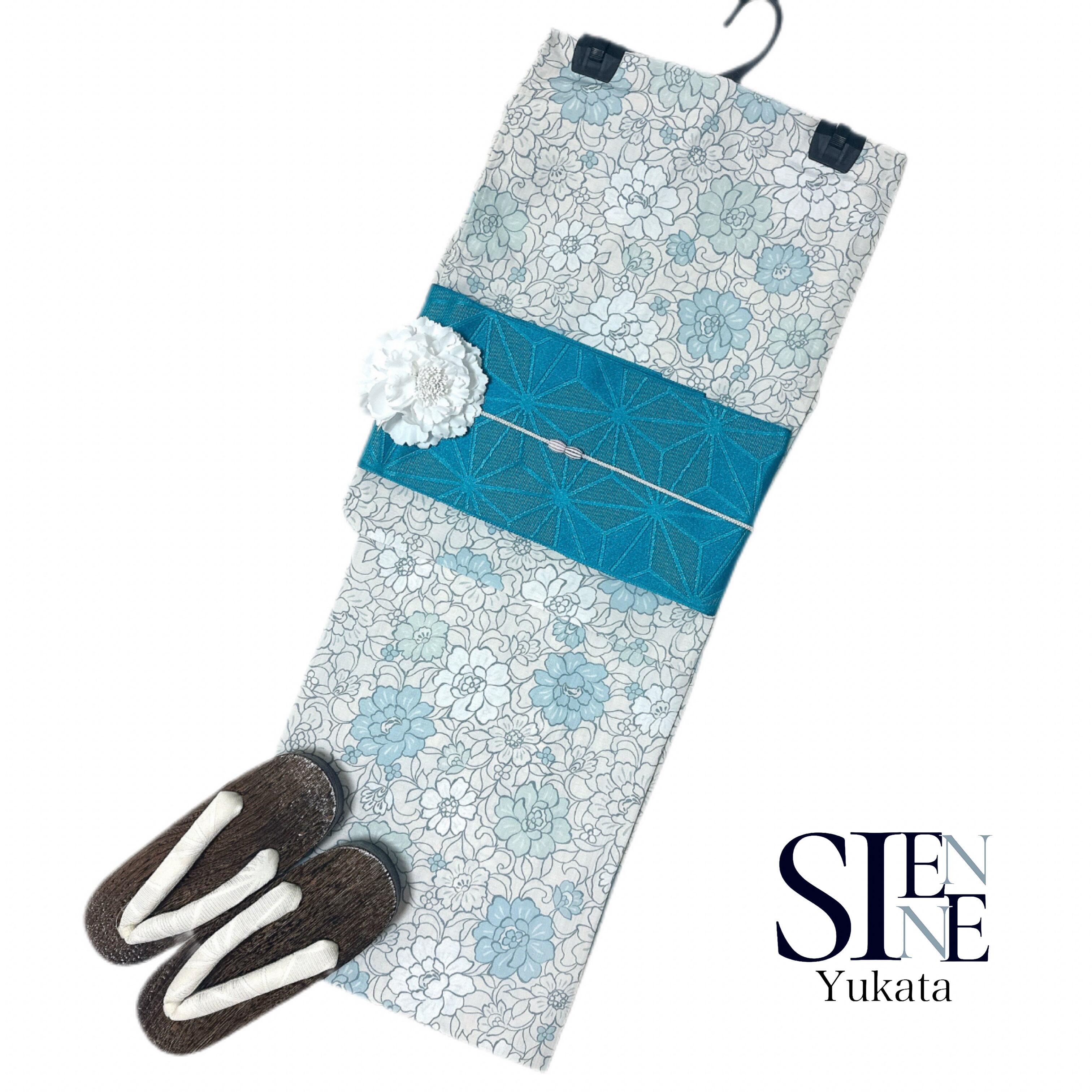 浴衣ジェンヌ 浴衣5点セット アイボリーにくすみミント等 花柄 ポリエステル ゆかた 半幅帯 浴衣