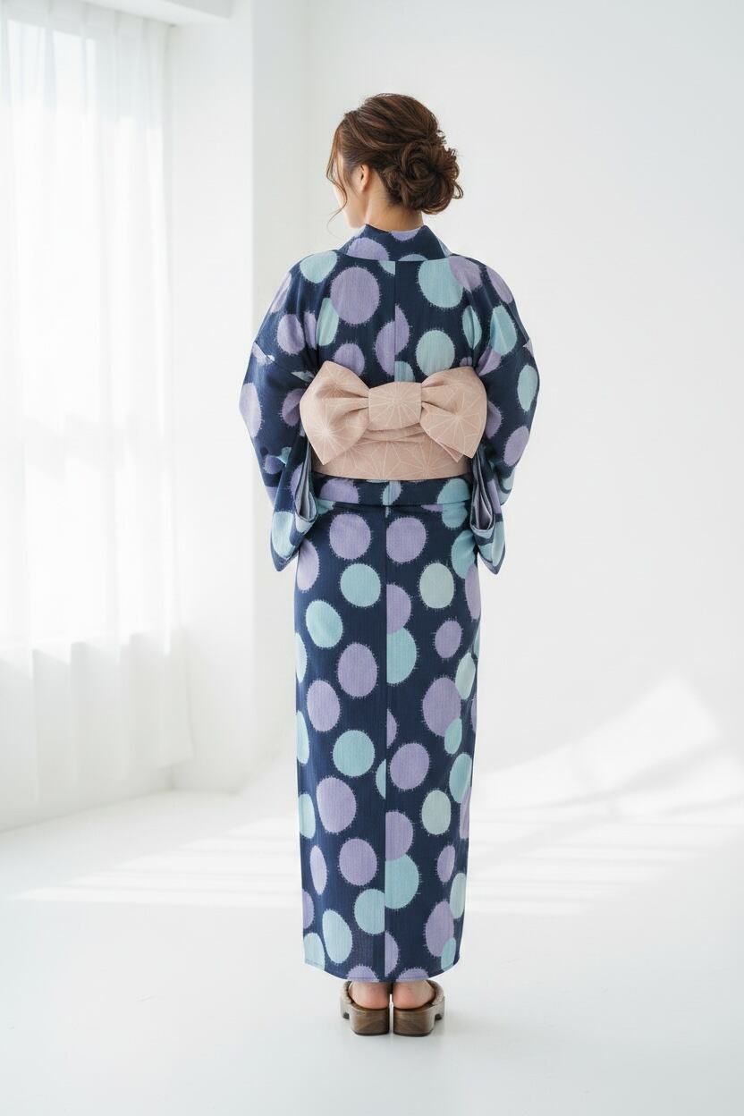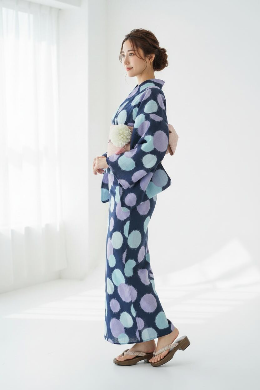 浴衣ジェンヌ 浴衣5点セット 高島ちぢみ 紺地に水色や紫の変形ドット柄 浴衣 半幅帯