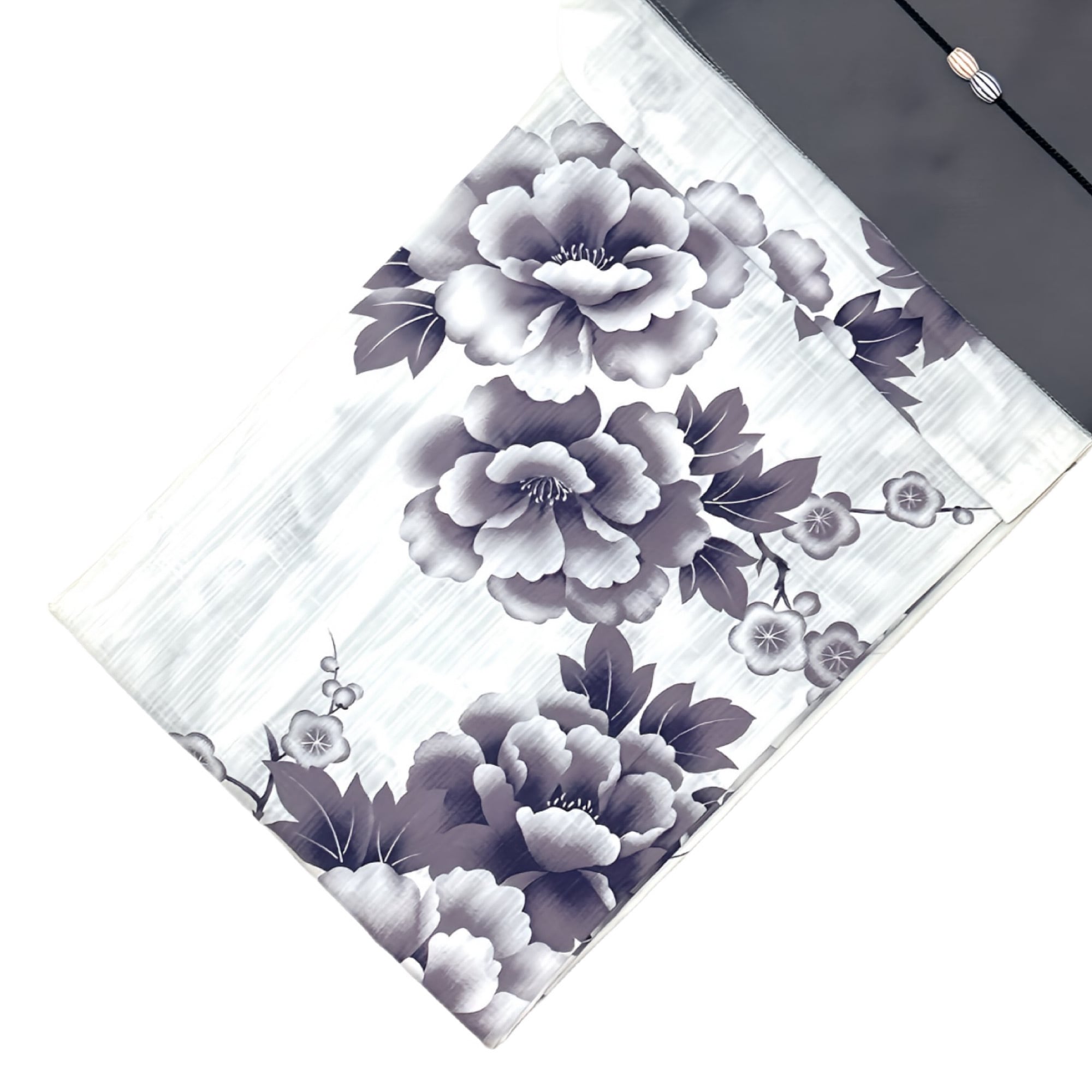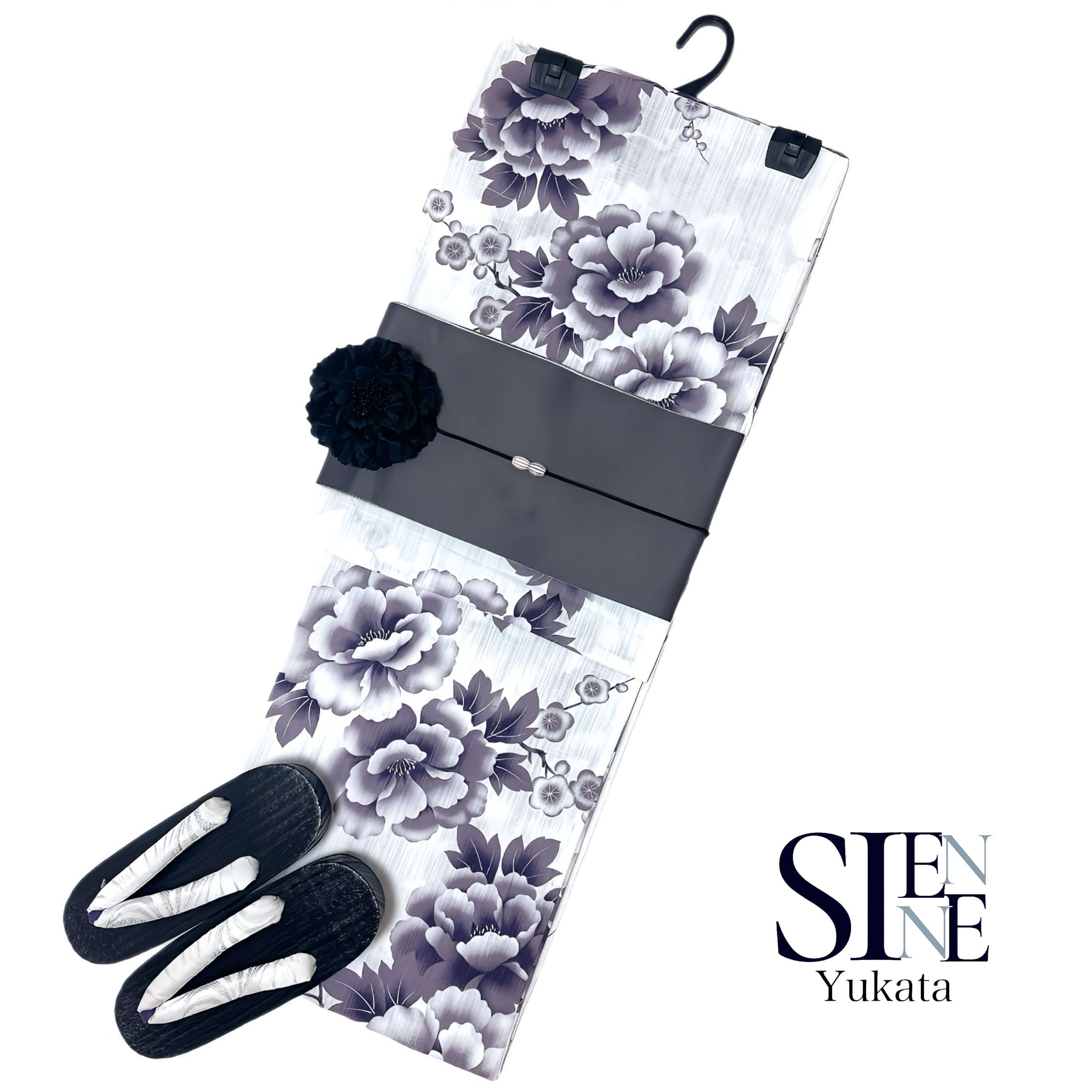 浴衣ジェンヌ 浴衣5点セット 白地にグレーの流れる椿 ゆかた 半幅帯 浴衣